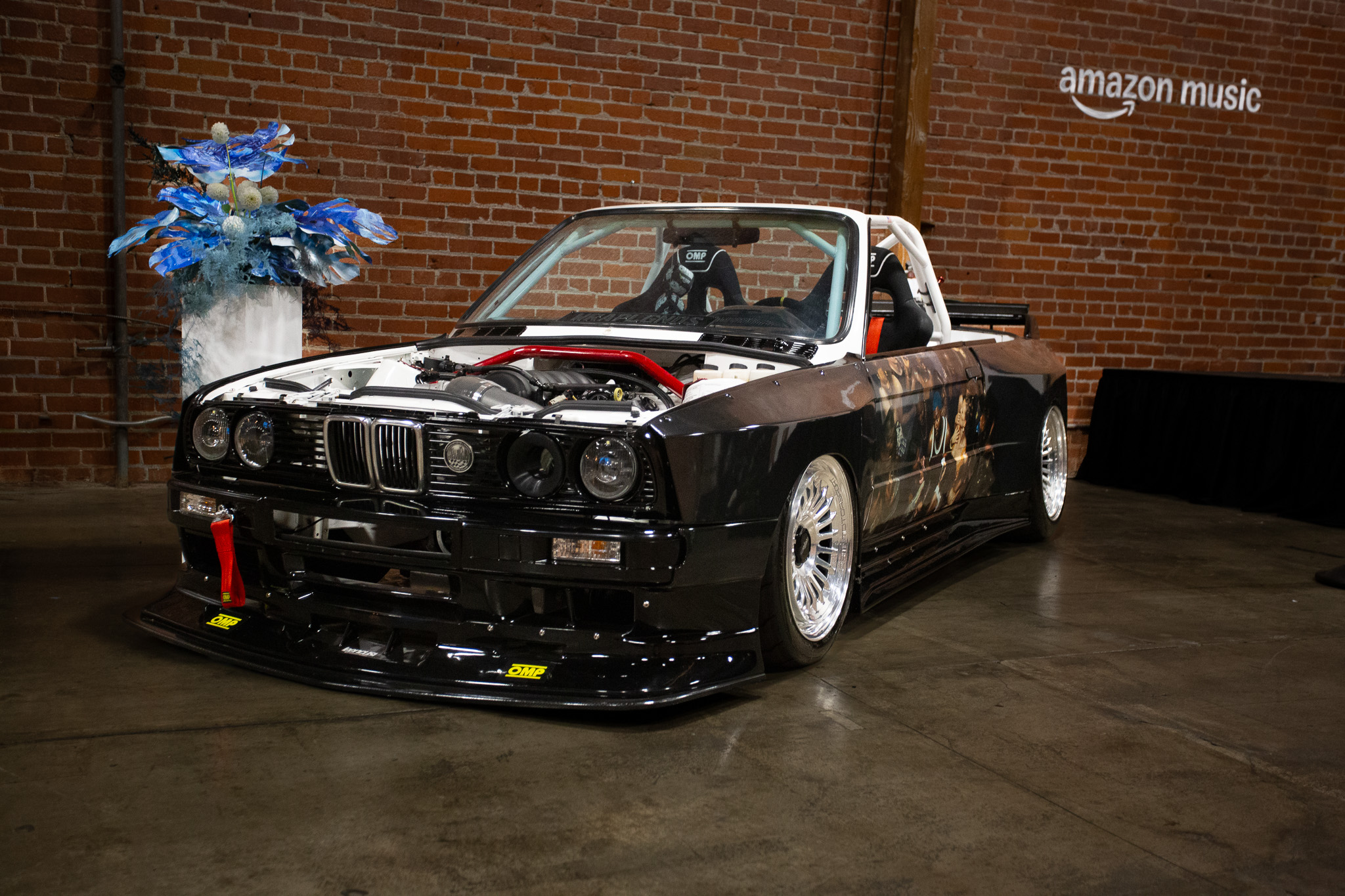 The venue featured two connected hangars — one built out as a live stage and DJ space branded by Amazon Music, and the other designed as a lounge area with food, custom merch, and detailed décor. Outside, guests were greeted by a full lineup of classic cars arranged on the lawn, setting the tone for the night’s nostalgic-meets-modern aesthetic.